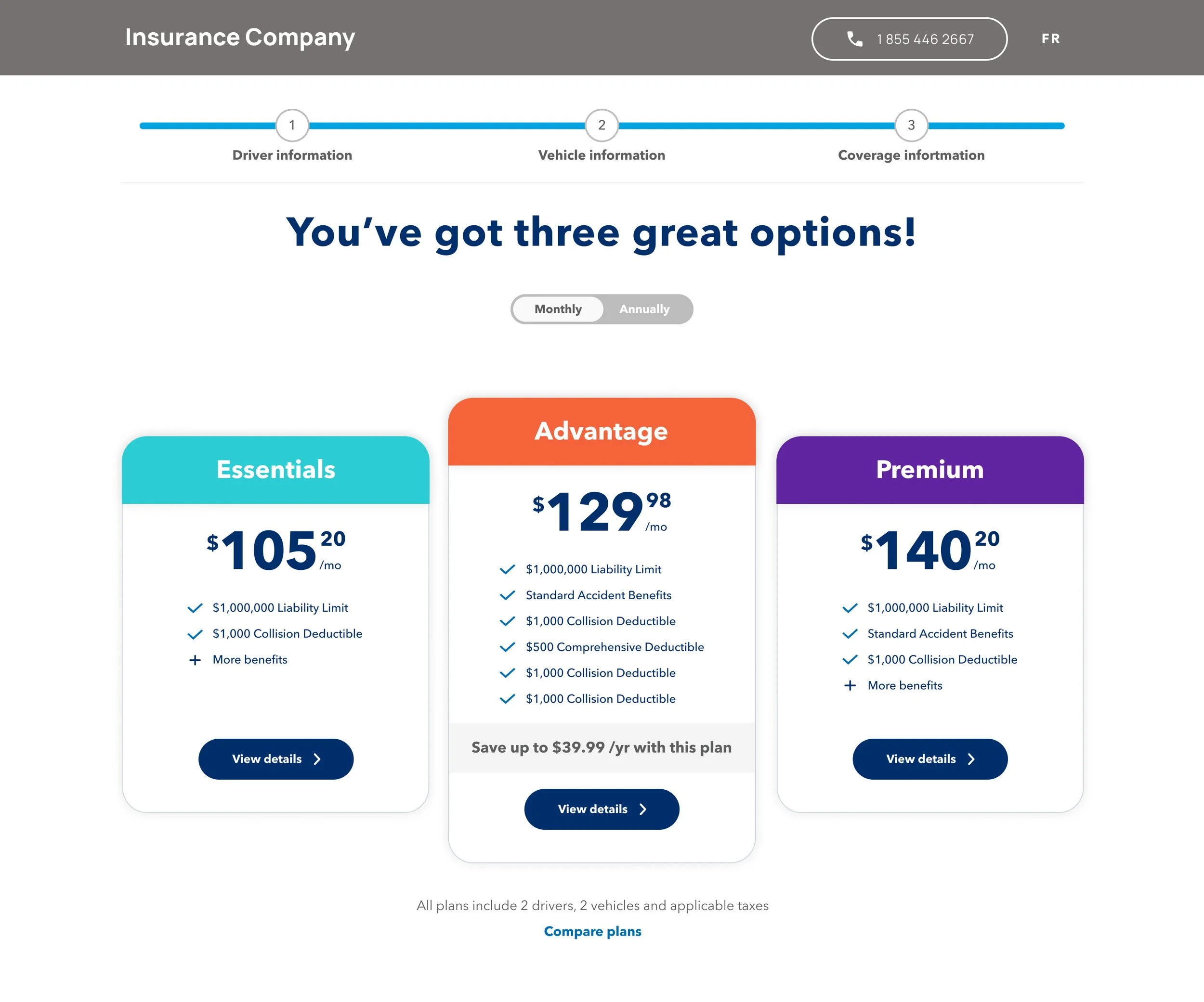 Displaying quote packages with a priority on the middle package let to more work for users as they were often scrolling up to compare high level coverage and price